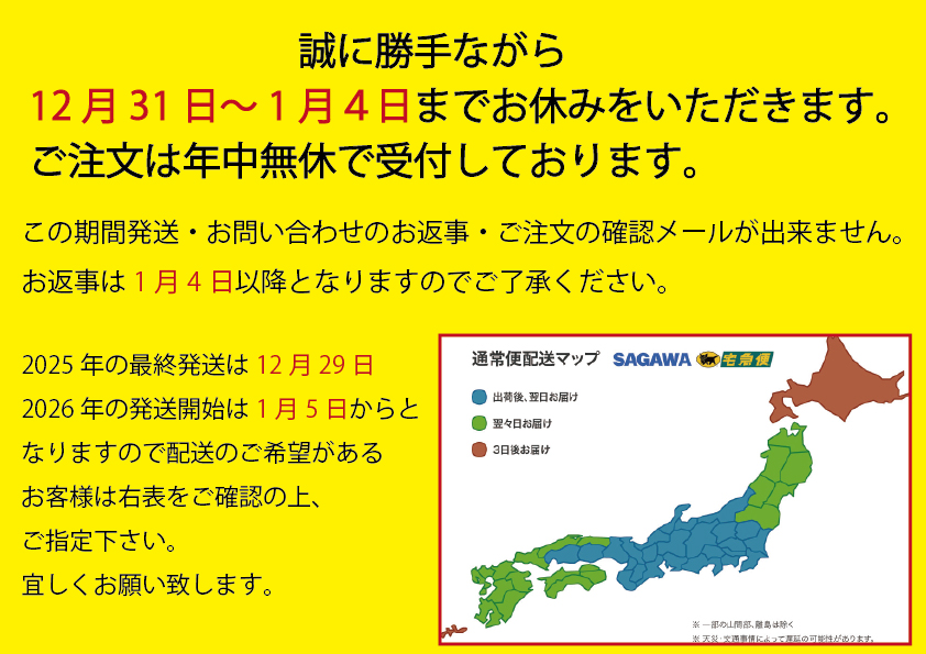 - 2024/10/1 4月からの配送業者の値上げに伴い、配送料を一律で140円値上げさせていただきます。ご不便おかけし申し訳ございません。